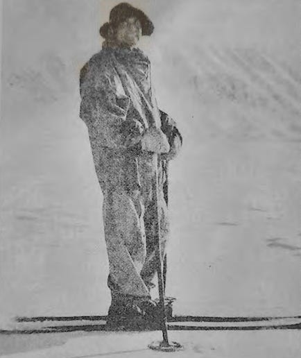 Marius Jensen rode the runners of the sledge. Hermann Ritter - the walking prisoner - was obliged to keep up on skis. To prevent the sledge from being bogged down in soft snow, Ritter often had to break trail in front of the dogs, or push the heavy cargo from behind.