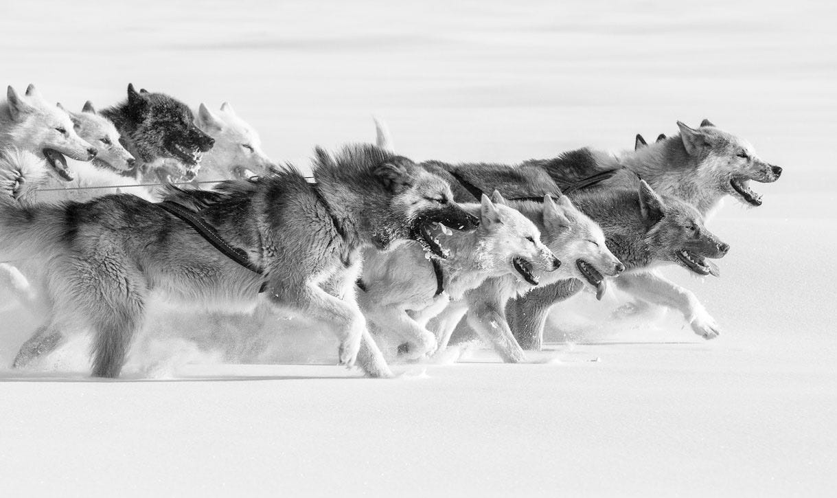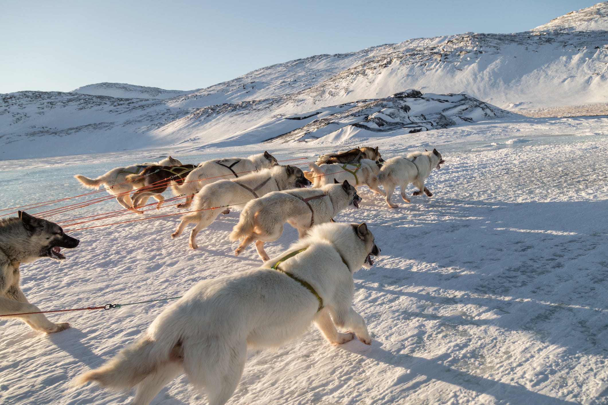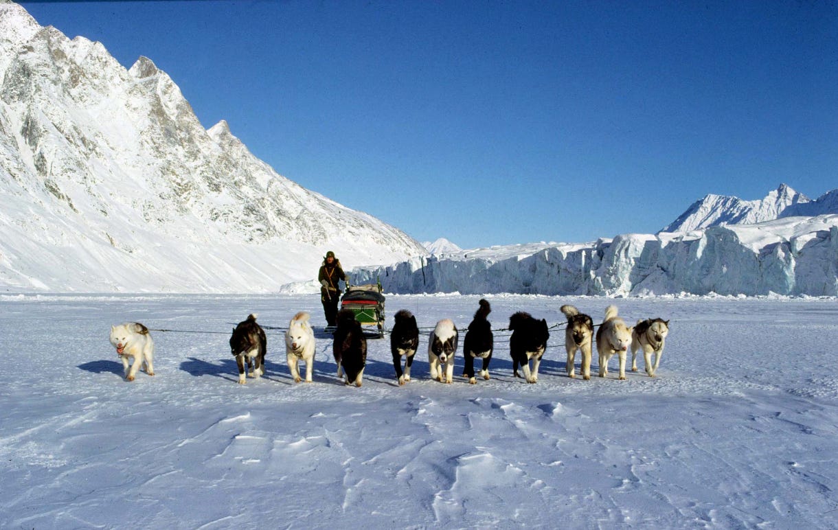 Instead of the usual train hitch—pairs of dogs running one behind the other - Greenland dogs were often arranged in a fan hitch. It spread their weight and, if the ice thinned and cracked at any point, only one or two dogs might fall through before the sledge could be stopped. In train formation, the entire team could be dragged into the watery void; sledge and driver swallowed with them.
