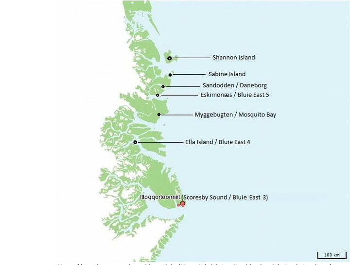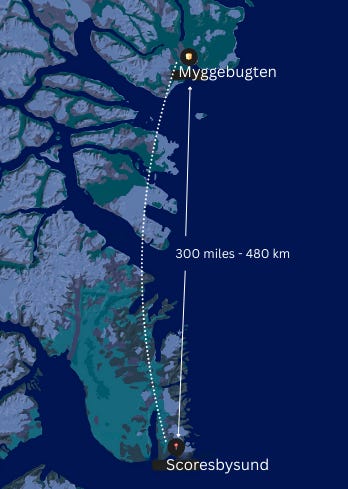 Scoresby Sound was south of Ella Island. Myggebugten was north. In his report Governor Brun noted: