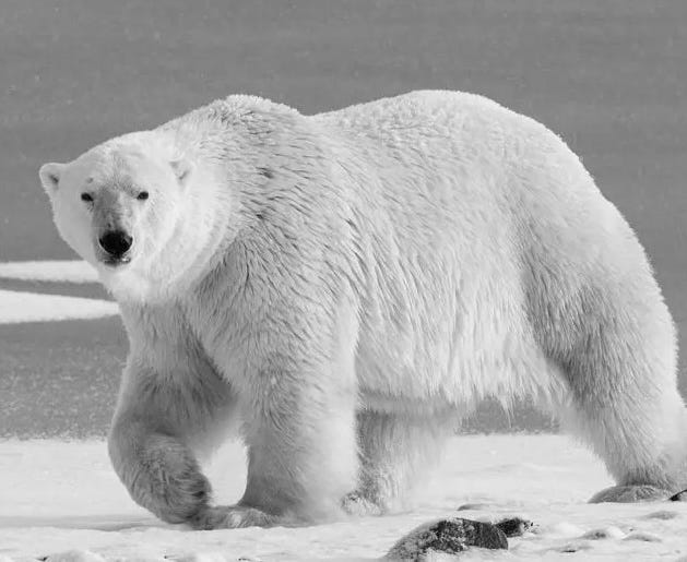 Finally, late one morning, he heard dogs outside. For a moment, a deep breath of relief stilled his mind. He went to the door. Head bowed to shield from the blinding light outside, he heard the familiar click-clack of a bolt-action rifle chambering a round. Upon opening the door he was confronted, not by one of his men, but by the surreal and menacing sight of a polar bear with a gun.