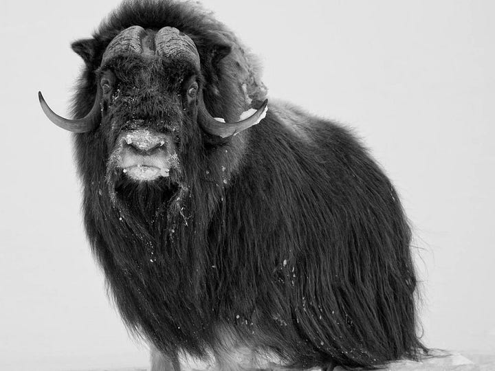 April is calving season for musk oxen—a month when the bulls are even more protective and aggressive than usual. If a bull senses danger, it will charge. That is 600 lbs (270 kgs) of bone and muscle, armed with a dense plate of horn across the forehead, together with powerful hooking horns hurtling at you with no sense of mercy. These meat juggernauts can reach speeds of 25–30 mph (40–50 km/h) with terrifying acceleration from a standing start.